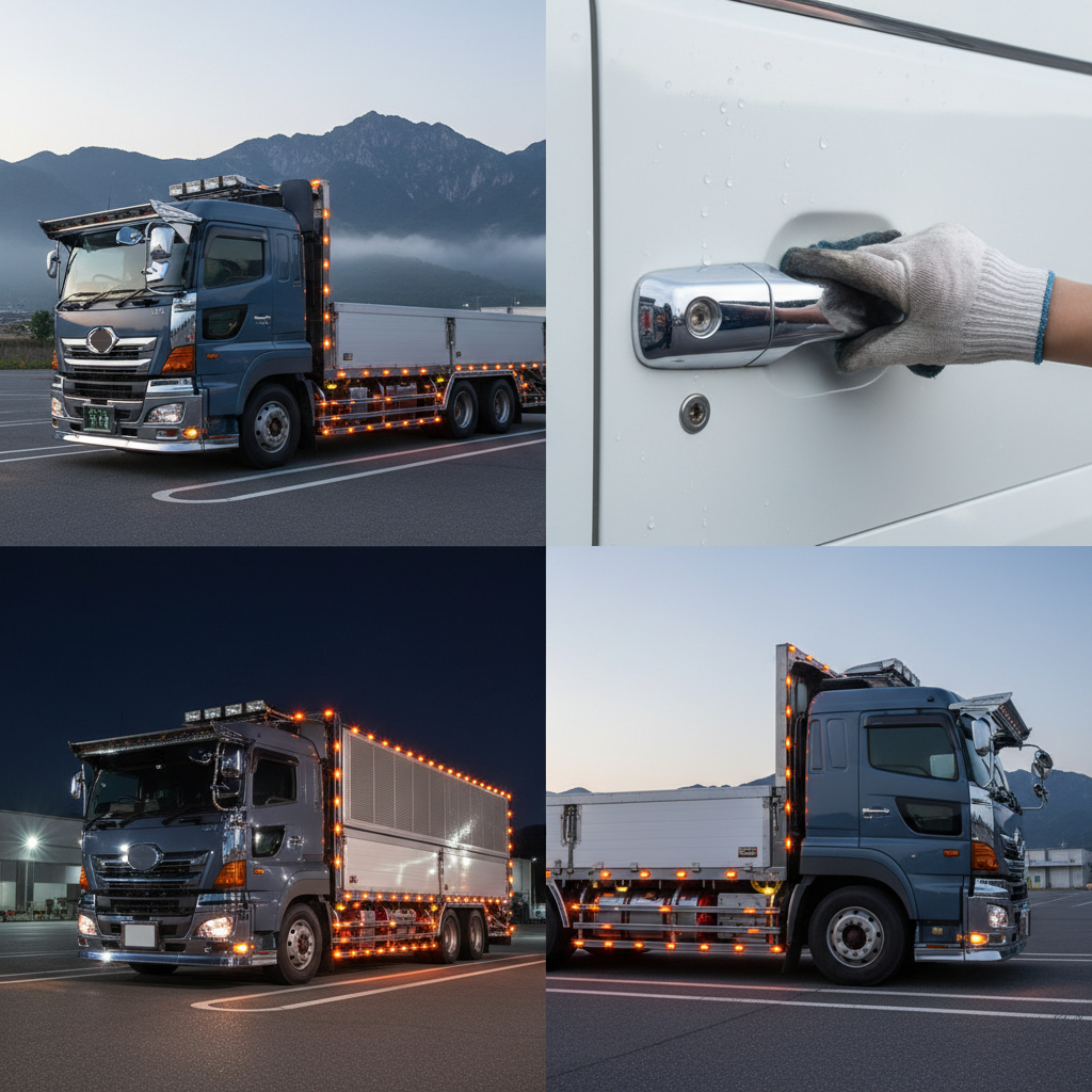 個性の表現: 全国を走る無数のトラックの中で、ひときわ輝く存在感を放つ。メッキパーツの輝きや、ナイトシーンを彩るマーカーランプの光は、まさにドライバー自身の個性を映し出すキャンバスです。世界に一台だけの、自分のこだわりが詰まった10トントラックを作り上げる過程は、何物にも代えがたい満足感を与えてくれます。